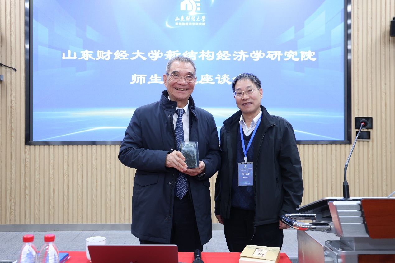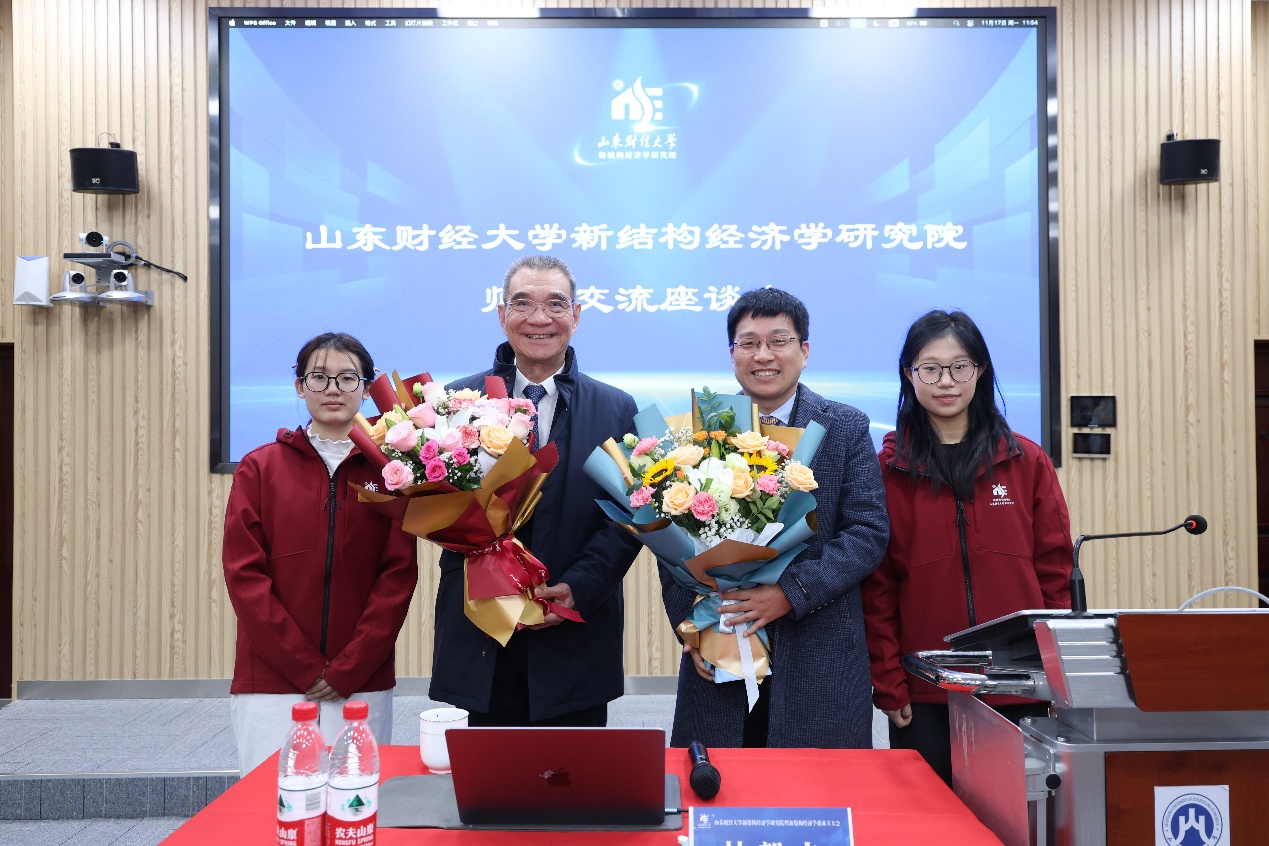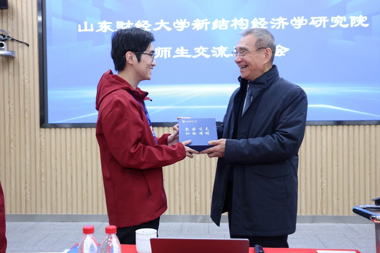 最后,殷克东向林毅夫赠送了精美礼物,并向林毅夫教授表示感谢。新结构经济学实验班同学代表向林毅夫和王勇献花,表达了崇高敬意。