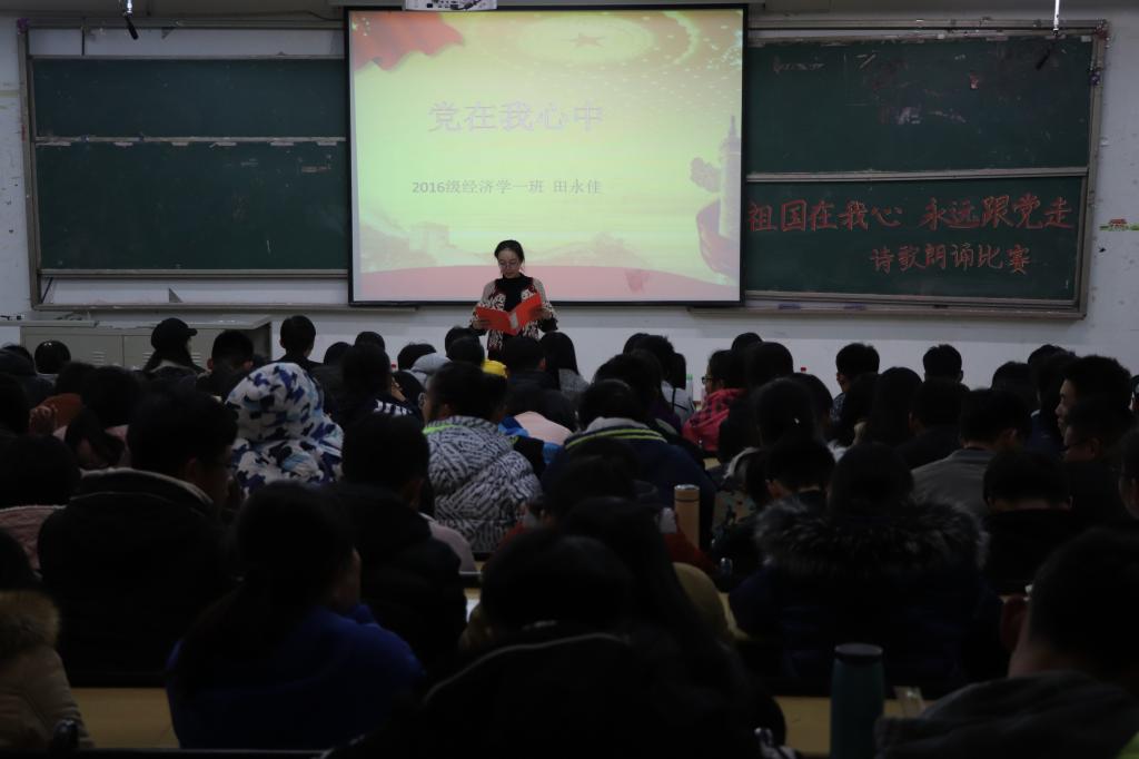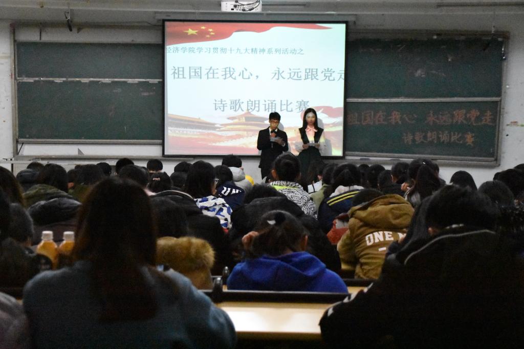本次比赛采用淘汰赛制,共有15名同学参加比赛。参赛选手台风稳健、落落大方、自信从容,借助精心设计的PPT,以及或悠扬典雅、或动感清新、或铿锵有力的音乐伴奏,演讲慷慨激昂、声情并茂,为观众带来一场精彩绝伦的视听盛宴。15级经济学二班李晓庆的《我的祖国》,高亢响亮的嗓音,圆润准确的吐字发音,饱含深情的肢体动作,歌颂祖国的秀美风光,地大物博,以及瑰丽灿烂的历史文化;16级经济学一班田永佳作品《党在我心中》,追溯党史,描绘党领导全国各族人民一路披荆斩棘,乘风破浪的伟大母亲形象,以一片赤子之心表达愿为国为党克己奉公,无私奉献的心愿;17级资源与环境经济学二班的孙子奇带来的《我们,他们》,以第一、三人称的叙述方式,展现中国共产党乐观英雄主义、大无畏的牺牲精神,唱响党为人民谋幸福的信念和决心。