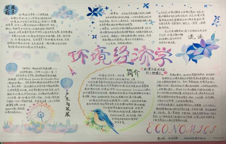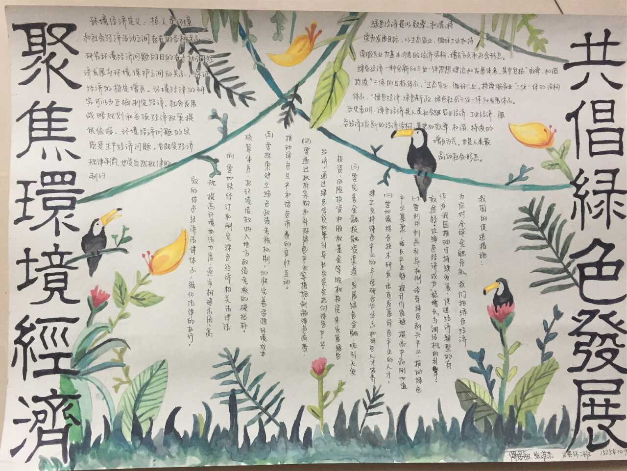 本次活动历时近半个月,共征集27份作品。16级经济学创新实验班楚小威作品《环境经济学》,作品以小见大,技巧丰富,文笔细腻,图文并茂。详细介绍环境经济学的定义,发展历程与发展前景。绘画采用依依杨柳、花繁鸟鸣,幸福摩天轮等细节烘托主旨,色彩纷呈,美观生动。16级资源与环境经济学二班张维杰、付煜敏的作品以“绿色、发展”为主题,融合自然风景、动物、隶书等元素,从绿色经济、环境经济、绿色发展措施三个方面呼吁人类保护自然,坚持实现经济的可持续发展。画面清新简约、灵动大方。BBIN宝盈游戏官网16级经济创新实验班的张伦、王楚薇、李小妍带来的作品《绿色经济》主题鲜明,围绕绿色经济,从绿色经济发展瓶颈、环境经济学、环境保护立法、发展绿色经济的解决方案四个方面展开描述,向人们展示绿色经济下的城市环境和社会生态,美观和谐,富有新意。16级国际贸易六班徐小晴的《聚焦环境经济,共倡绿色发展》,全版以绿色为基调,清新亮丽,画面草叶葳蕤、杨槐清翠、柳榆葱茏,展现绿色发展的主题,从生态经济学代表人物、生态经济学概述、生态经济学在中国的发展三方面出发,系统介绍了生态经济学的相关知识及对未来前景的评估,契合环境经济的意旨。