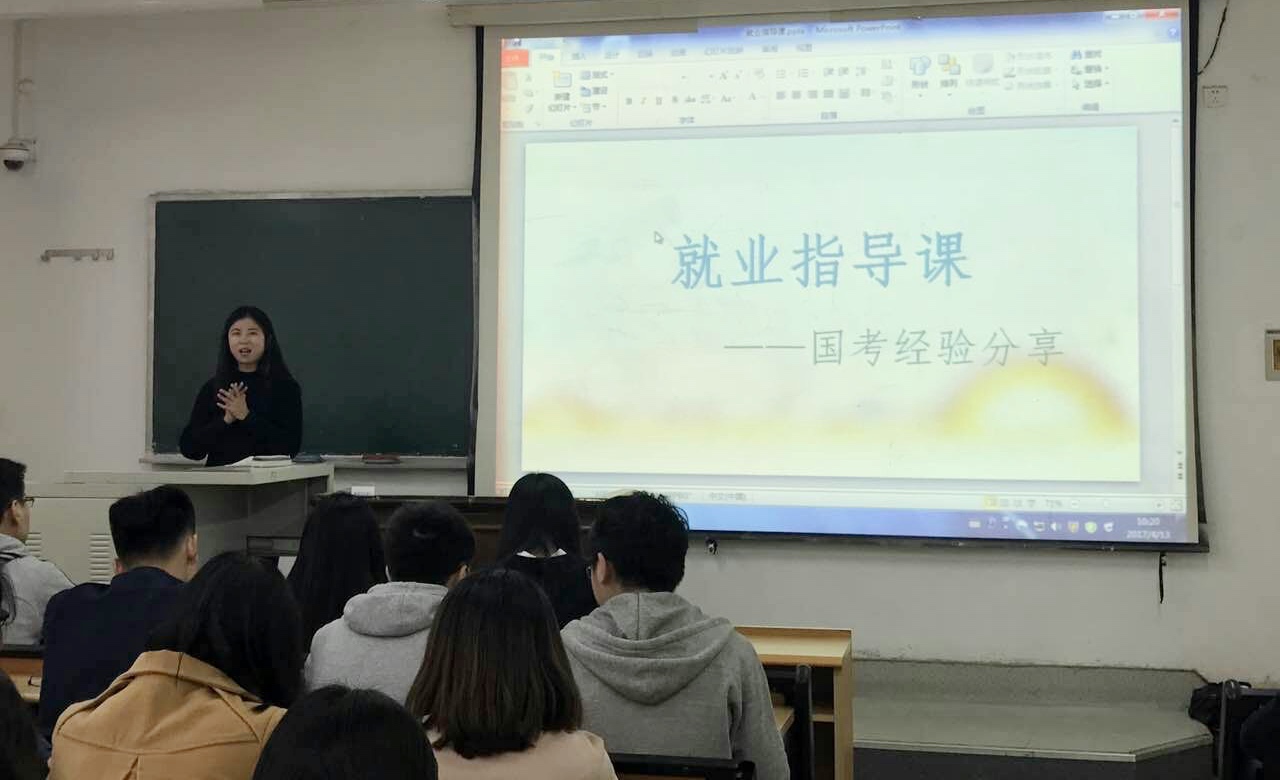 三位同学详细介绍了自身的国考经历,分享本次国考的实战经验。建议大家大学期间应不断拓宽知识结构,广泛涉猎,尽可能考取英语四六级证书、计算机二级证书、会计从业资格证等,来增加报岗时的可选范围;及时掌握各个岗位的招考信息,清楚相关专业设置和应届要求;细致讲述了笔试的基本题型、答题方法、答题策略和技巧,面试的基本礼仪和注意要点;指出在日常生活中要通过多媒体等渠道加以积累,在丰富知识的同时,锻炼自我逻辑思维。她们向同学们提出三点建议:一、树立目标、清晰定位。同学们应做好职业规划,充分了解自身特色,树立明确目标并为之不懈努力;二、合理规划、珍惜时间。根据个人学习规律及特点,合理安排复习备考时间;三、轻松备考,调整心态。要戒骄戒躁,时刻保持积极昂扬的心理状态,通过与老师同学的沟通,适当减轻压力。