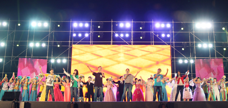 舞蹈《鼓舞中华》拉开了晚会序幕,激情澎湃,气势豪迈,让现场观众感受到了超乎想象的东方神韵。歌曲《节日欢歌》、《国家》、《又唱浏阳河》、《祖国之恋》,合唱《走向复兴》、歌舞《在灿烂阳光下》体现出全校师生对伟大祖国翻天覆地变化的讴歌和实现中华民族伟大复兴的豪迈。舞蹈《众里寻他》、《俏花旦》、《响亮节拍》,歌曲《让梦想起航》展现了我校青年学生充满青春活力、积极向上、多才多艺的风貌。由军训团教官和2011级新生合作完成的军体拳表演充满力量,2011级少数民族新生带来哈萨克民族舞蹈《黑走马》、维吾尔族民族舞蹈《萨玛舞》充满浓郁的地方和民族特色,同时也反映出2011级新同学“我们是BBIN宝盈游戏官网主人”的心声。